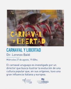 Carnaval y libertad – Dir. Lorenzo Baldi El carnaval uruguayo es investigado por un director que busca ilustrar la evolución de una cultura popular que, en sus orígenes, tuvo una gran influencia italiana y europea. A través de una multiplicidad de voces entre las que se encuentran las de José Pepe Mujica, Lucía Topolansky, Edu “Pitufo” […]