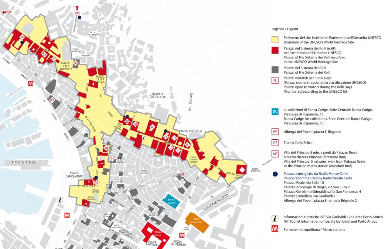 Nel centro storico di Genova si trovano più di 100 palazzi di nobili che all’epoca del grande potere finanziario e marinaro della città servivano di alloggio a illustriti visitatori. Questi furono denominati i Rolli dovuto alla stoffa drappegiante che era messa fuori dal palazzo offrendo un luogo dove ospitarsi. 42 di essi sono stati dichiarati Patrimonio Culturale Universale dall’UNESCO.